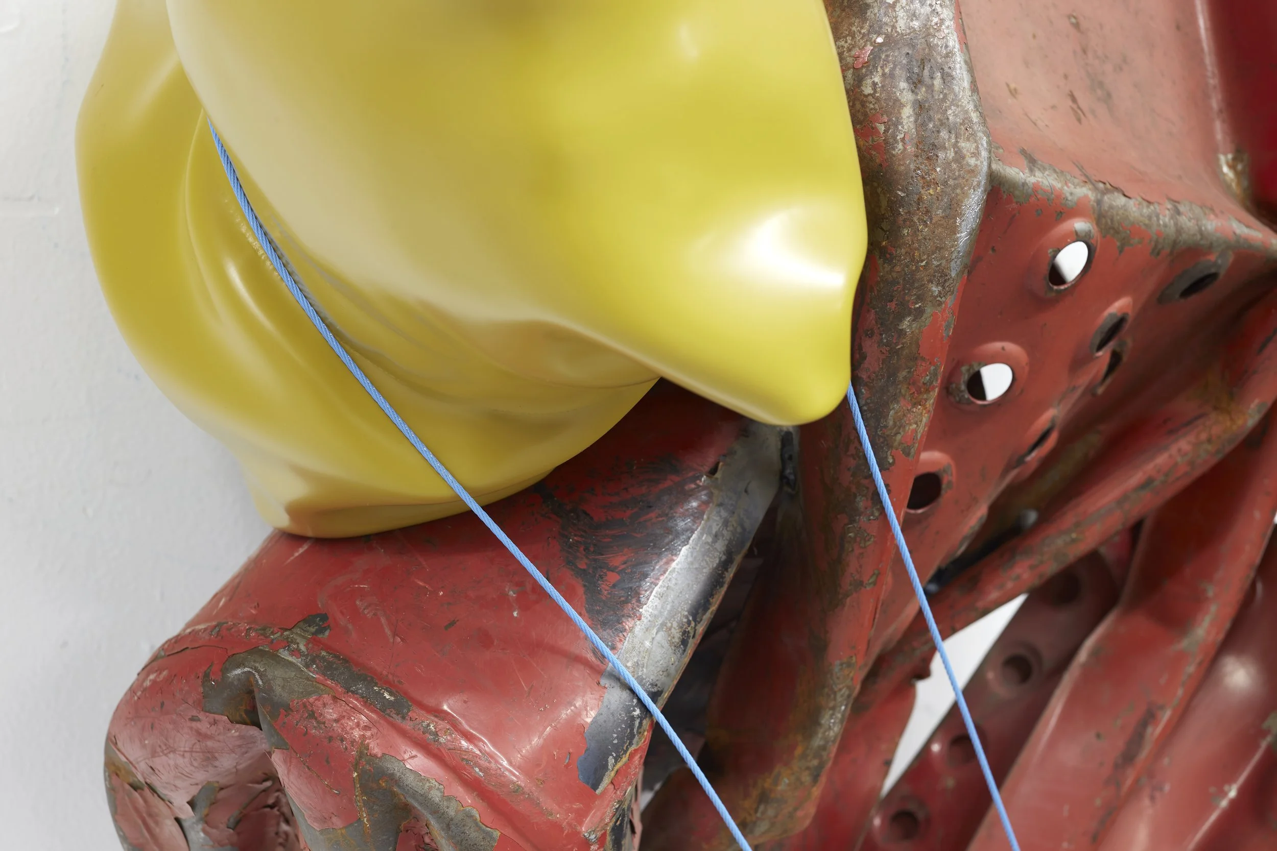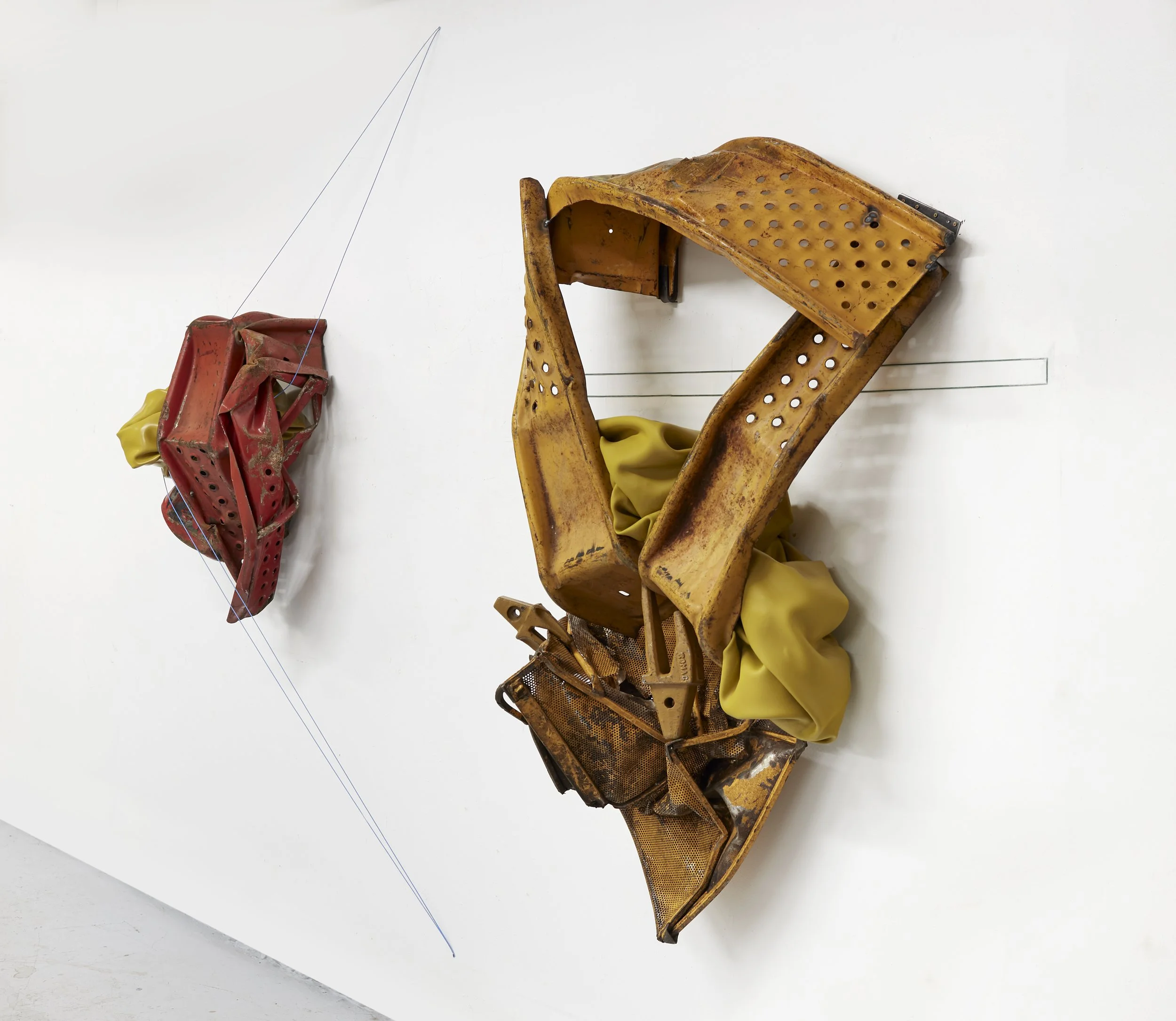 The metal forms of Postcapitalist Desire usher in the whir of industry, while the languid, bodily paint skins bring in gravity and chewy softness. They imply the weight that accompanies the inseparability between one’s work, one’s value, and one’s being. The paint skins perform the dissonance a body feels when it is out of sync with its own actions—when we’re zombie-like; not recognizing that our choices and actions are prompted by economic tides. While the metal and skin are foregrounded in scale and color, taut wire—which I call a “shadow perspective”—is enacting critical tension in the composition. Its reaching lines point towards information beyond what’s immediately available, and in some instances, exert pressure upon the plush paint skins.