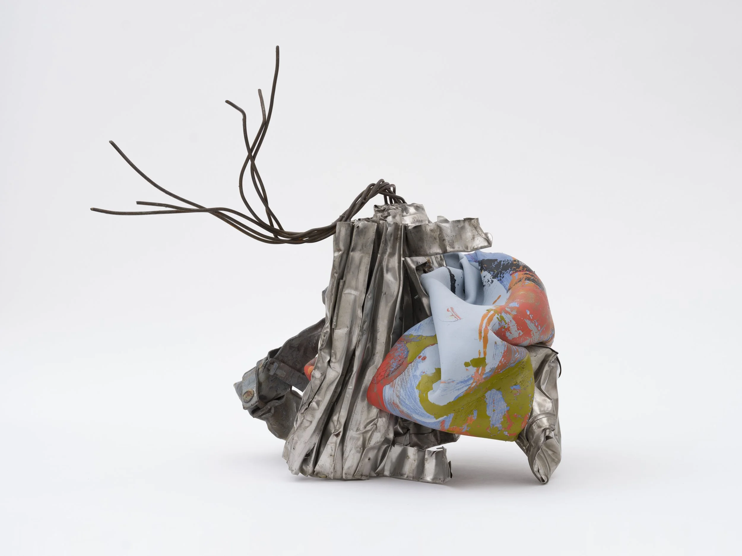For my solo presentation Wildflowers at Frieze London, the works mark a return to the intimacy of painting within my studio practice. I had missed the brush—the immediacy of gesture and the physicality of paint—and these pieces offered an opportunity to re-engage with movement as a formative element in my process. Using chrome as a base, I developed the paint skins through water pours, transfers, and a backward-to-front technique, painting blindly before lifting the skin, to produce layers of unpredictable personality and texture. The piece reflects both a rediscovery and a renewal of painting as it exists within the language of sculpture.